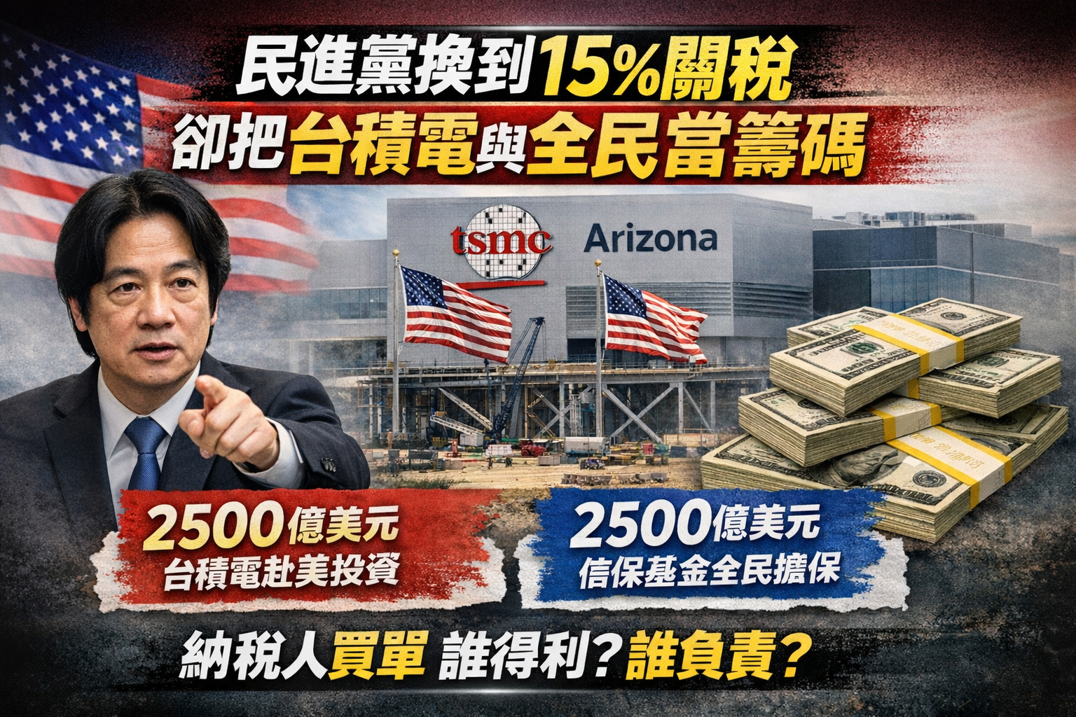 事實上,這15%的對等關稅,並不是民進黨談回來的優惠,而是用2500億美元對美投資與2500億美元信保擔保換來的結果。換句話說,關稅沒有消失,只是被轉嫁,由台積電與納稅人代為買單。